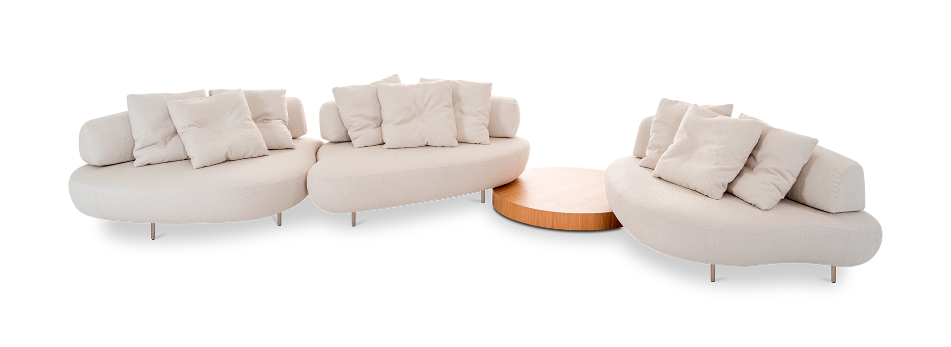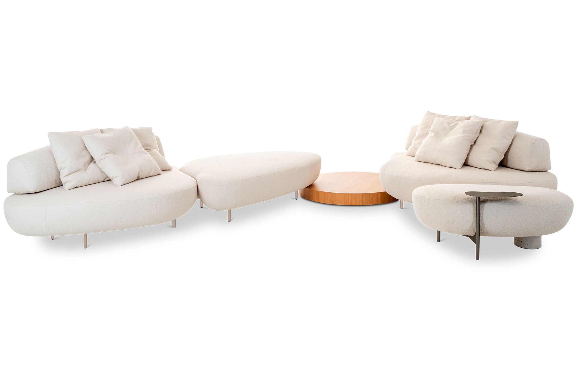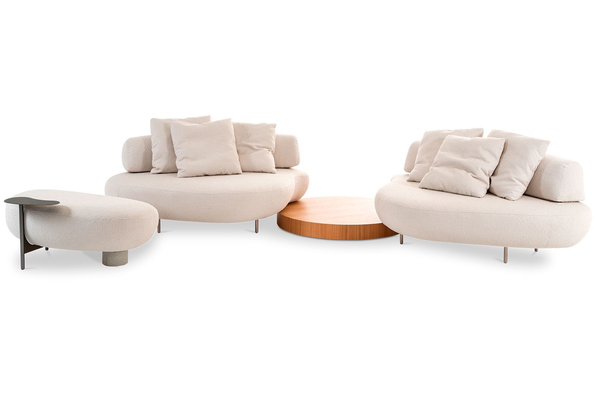 Visually, our Montaggio presents a precise yet affectionate and curvaceous fit. The organicity of the modules forms an elliptical upholstery, which invites you to relax. Very functional, the seats can be used individually as chaises; the Montaggio sofa also features round tables that function as connections and a moldable, loose back that can give the piece multiple functions.