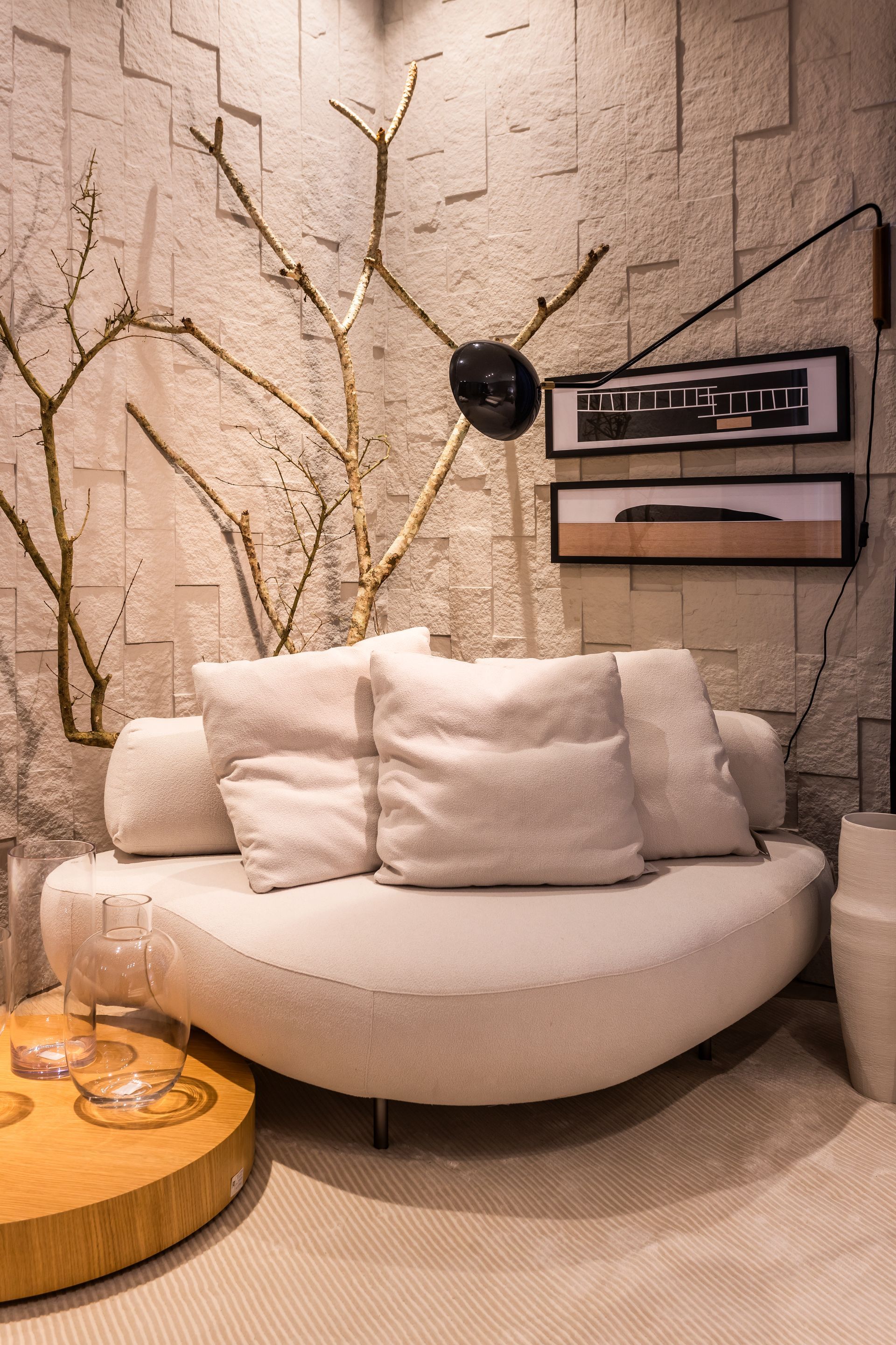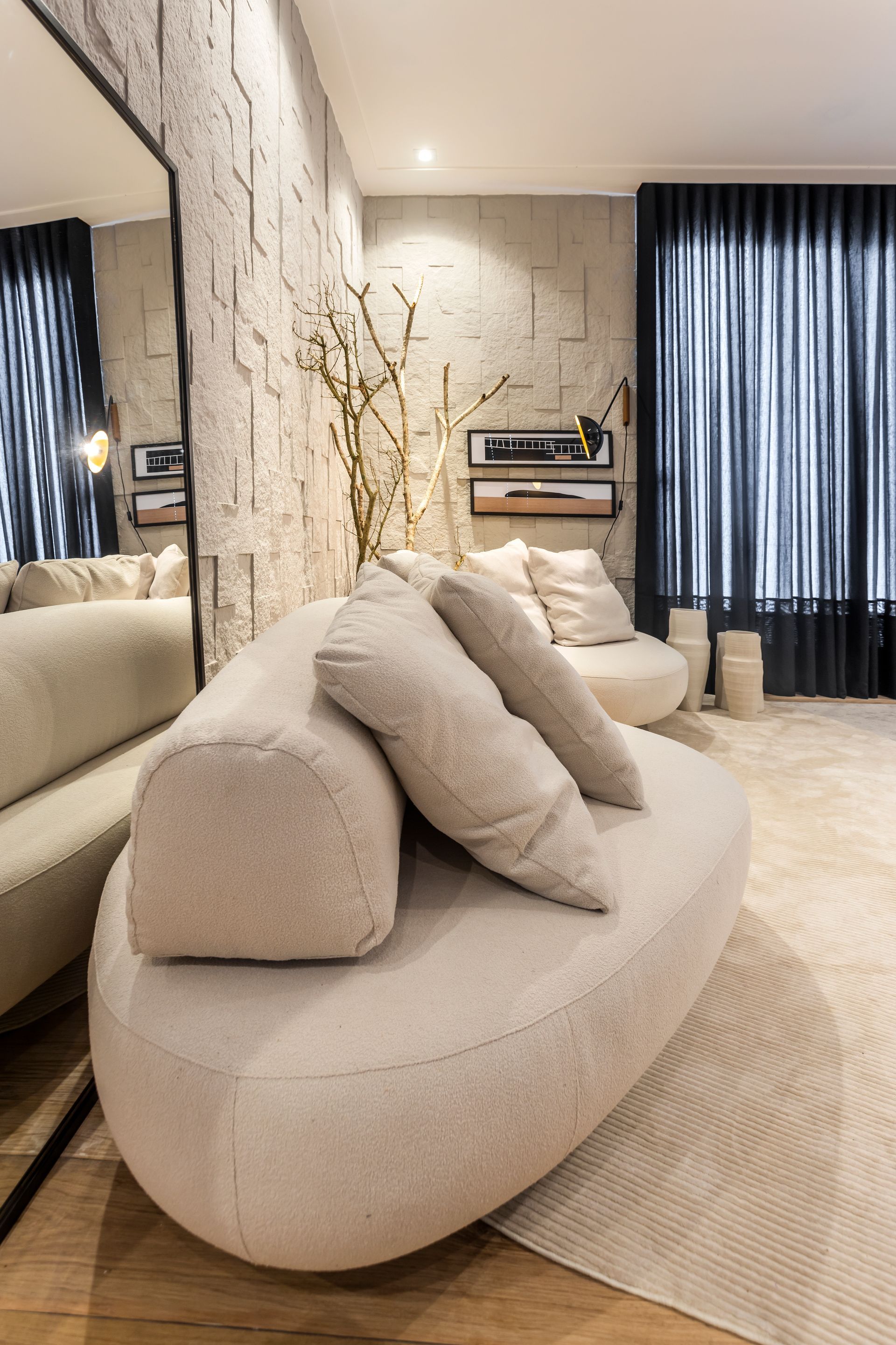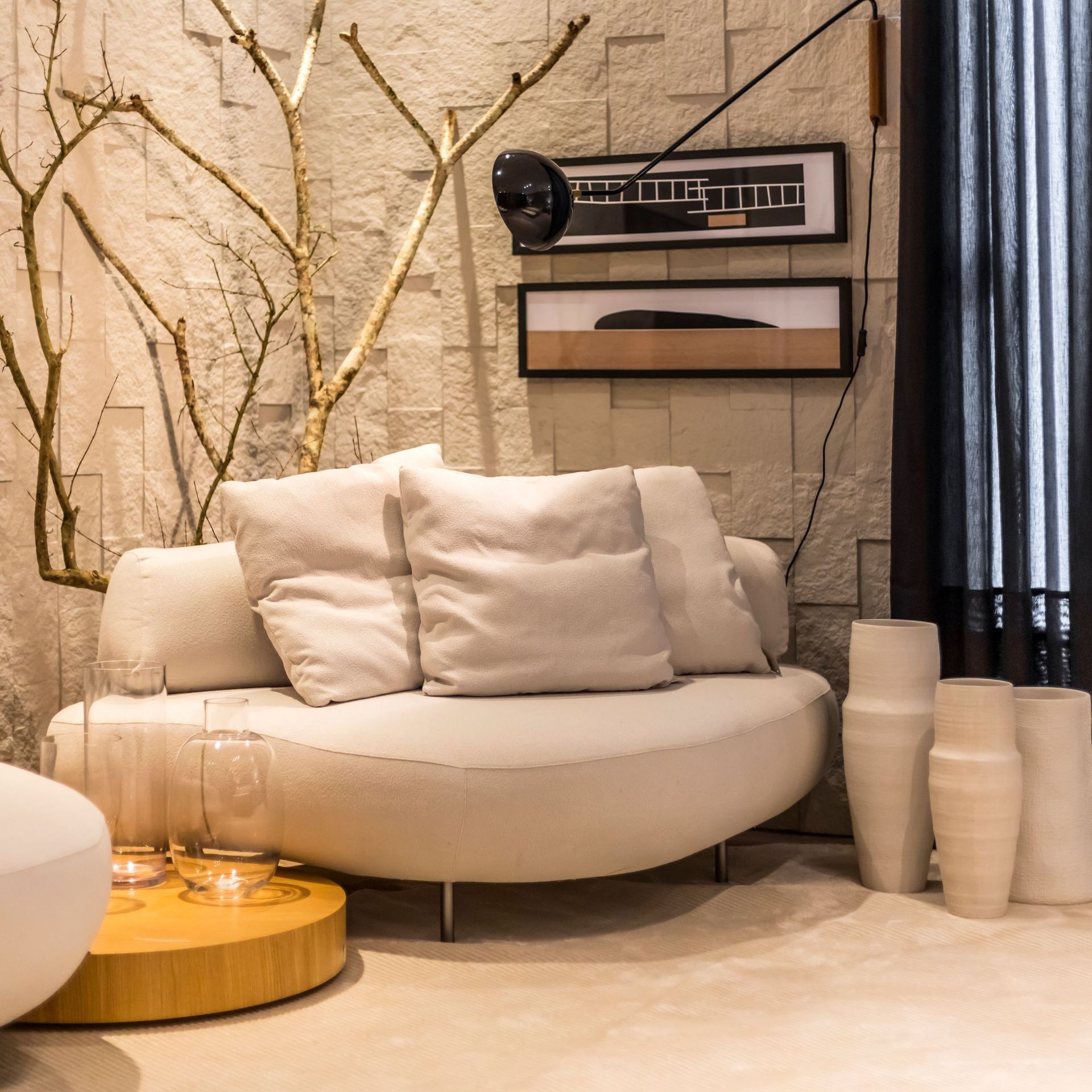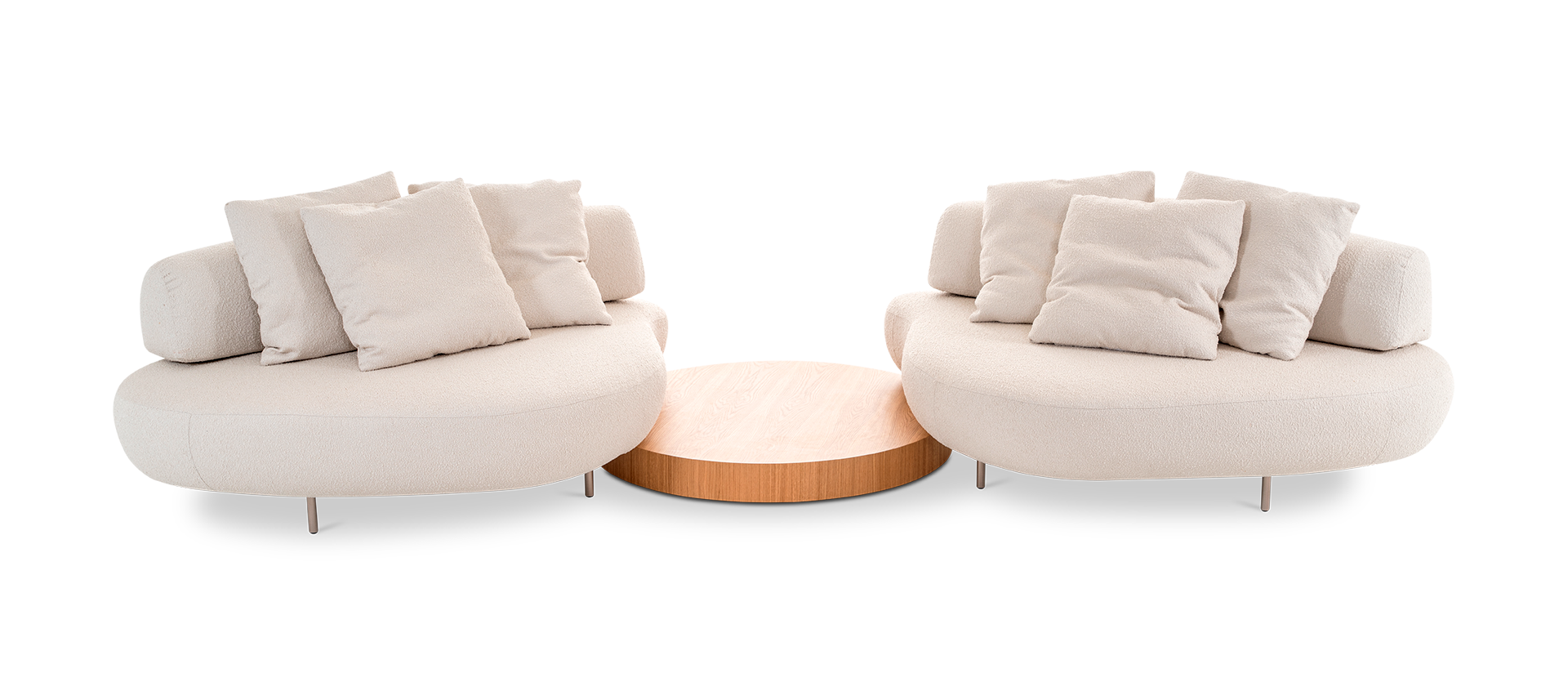 Visually, our Montaggio presents a precise yet affectionate and curvaceous fit. The organicity of the modules forms an elliptical upholstery, which invites you to relax. Very functional, the seats can be used individually as chaises; the Montaggio sofa also features round tables that function as connections and a moldable, loose back that can give the piece multiple functions.