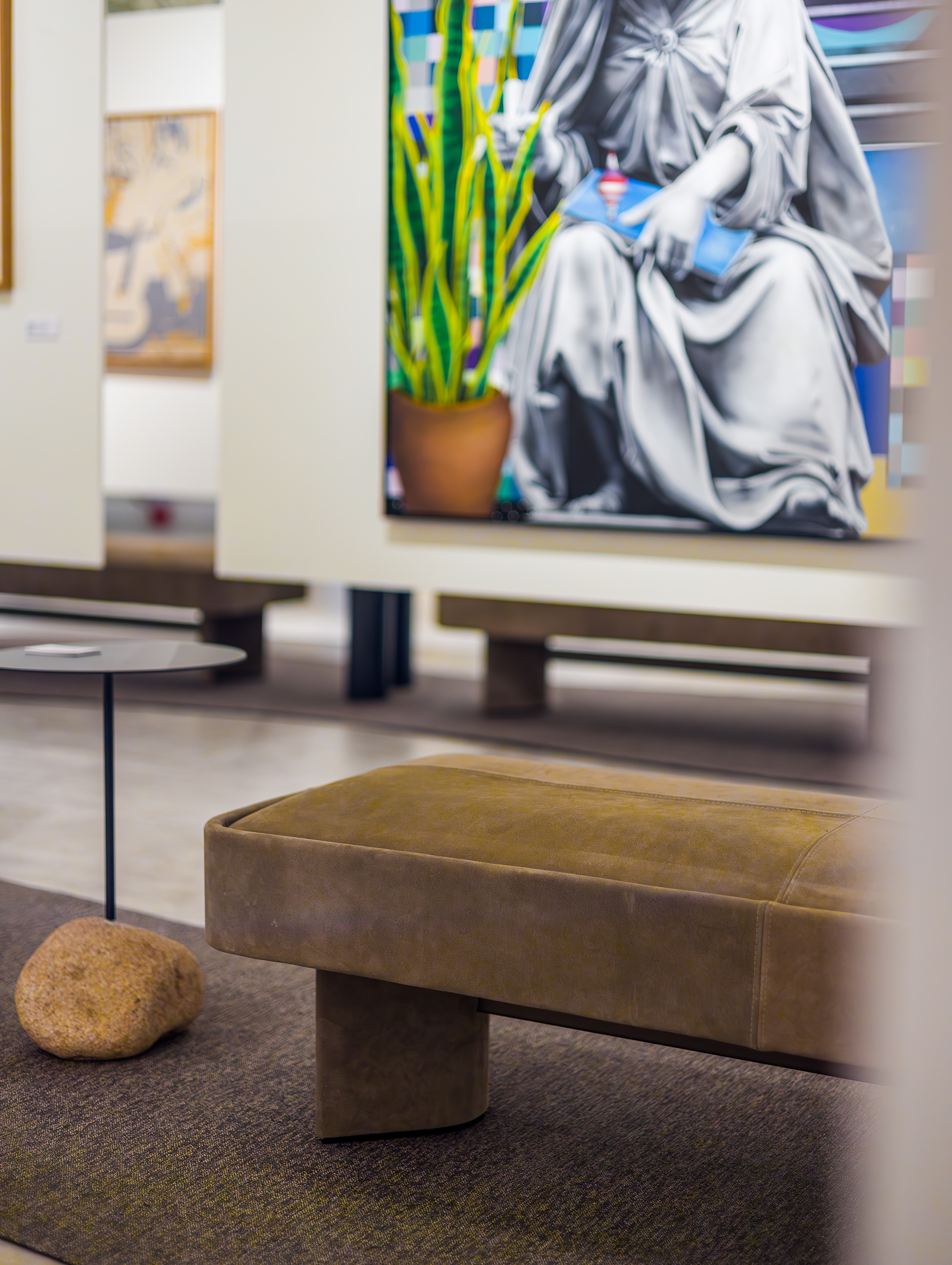 Neste contexto de inovação e criatividade, destacam-se peças de design exclusivo que ampliam a experiência do espaço. A Poltrona Wave, assinada pelo designer Crystian Freiberger, é uma ode à natureza e ao mar, com uma estrutura única e fluida. O Banco Tangram, com design de Arthur Casas, oferece conforto e versatilidade com seu assento ultraconfortável e design geométrico. E a Poltrona Arcos da Lapa, uma homenagem do designer à sua amada, captura a essência do Rio de Janeiro, incorporando concreto em sua estrutura para criar um cenário para momentos de descontração.