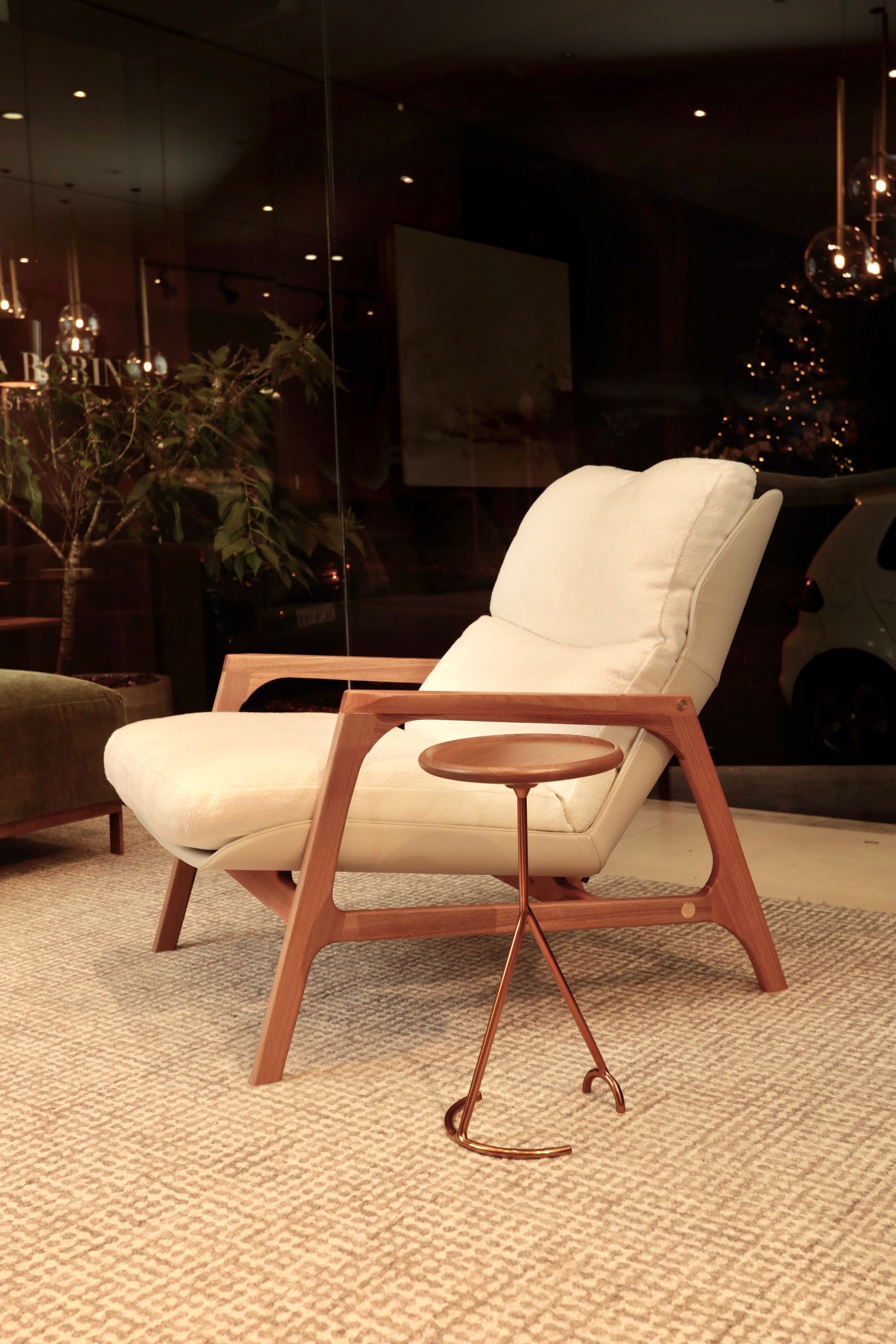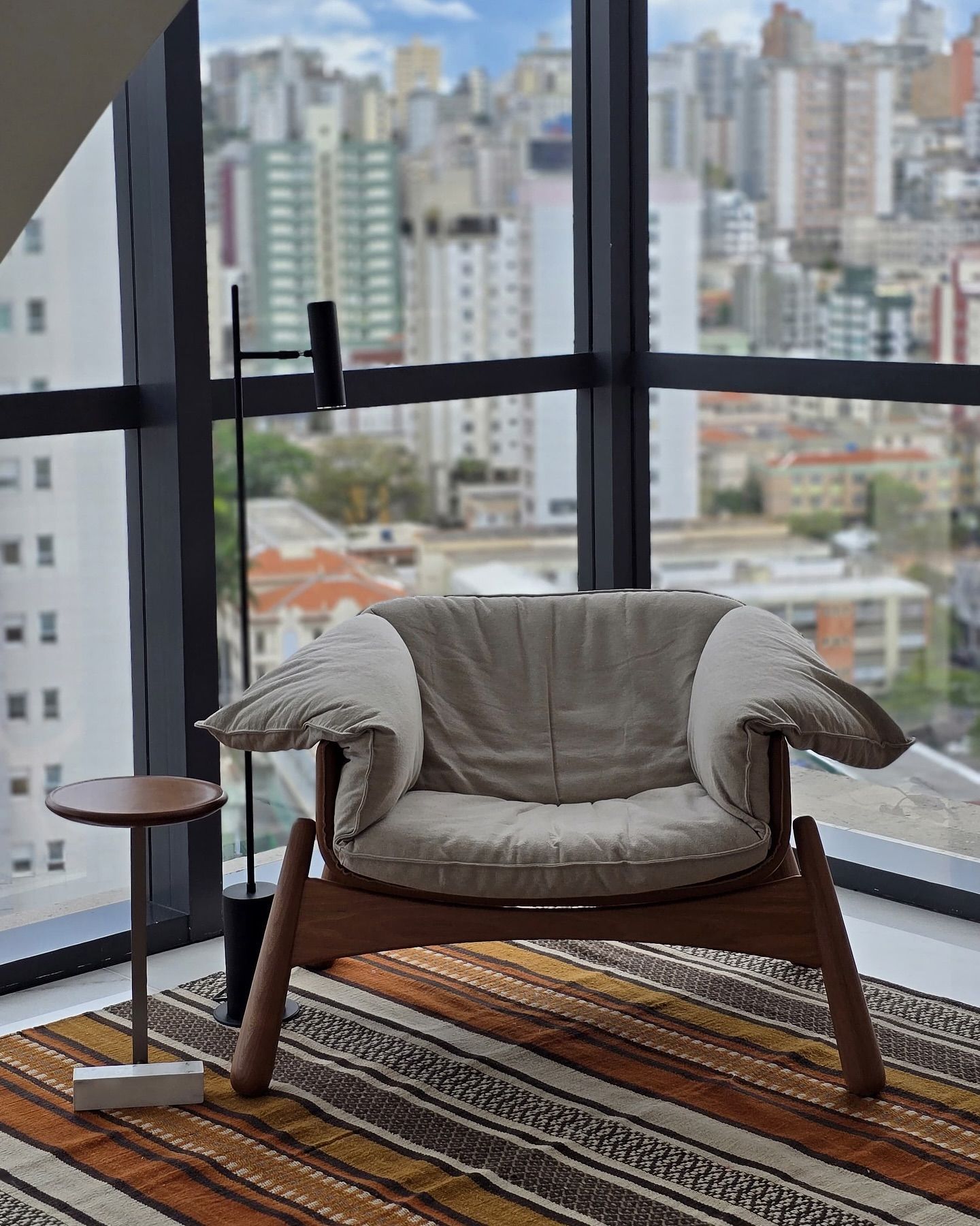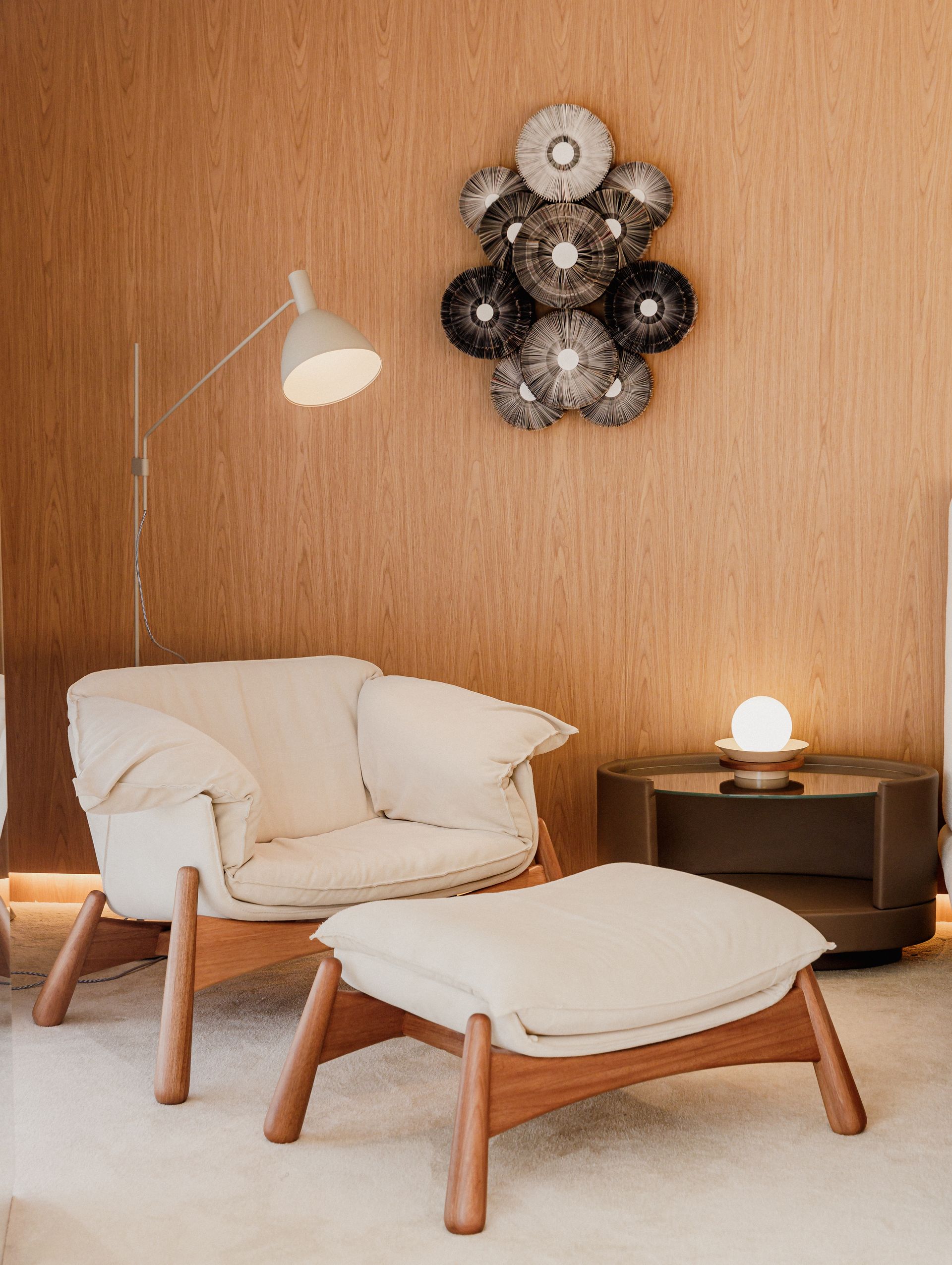 Pater, o tempo assume também uma dimensão simbólica. Inspirada na figura da poltrona do pai, a peça carrega memória, afeto e conforto profundo, reinterpretados com rigor contemporâneo. Seu desenho essencial, aliado ao cuidado construtivo, do equilíbrio das proporções ao uso de materiais duráveis, faz com que seja difícil situá-la em um período específico. Essa ambiguidade temporal reforça a ideia de permanência: trata-se de um estofado que constrói vínculo com quem usa e permanece relevante à medida que o espaço e a vida mudam.