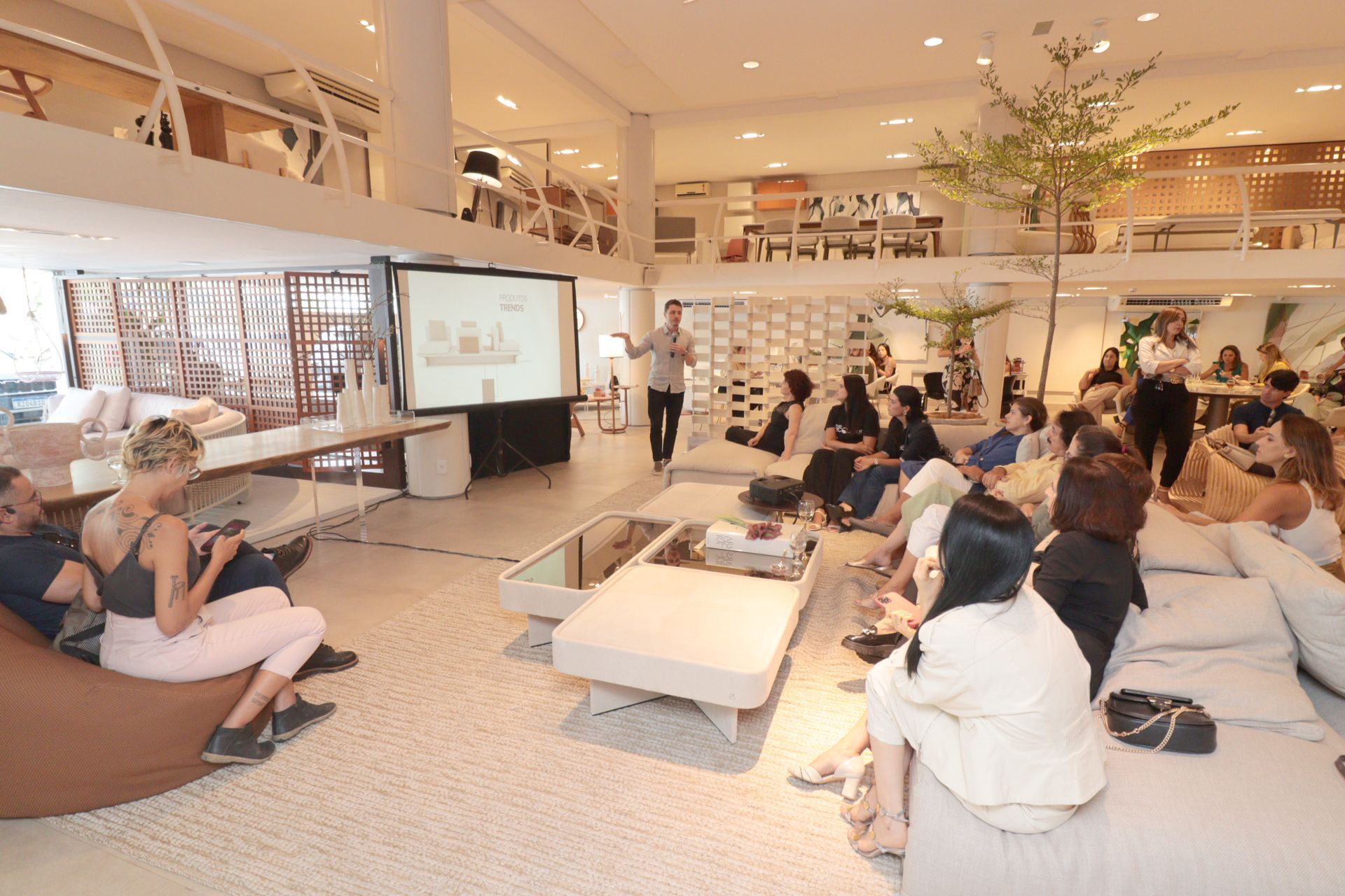 Os convidados puderam apreciar de perto os sofás, mesas de centro, puffs e espelhos, que foram dispostos em diferentes ambientes da loja, criando cenários inspiradores.