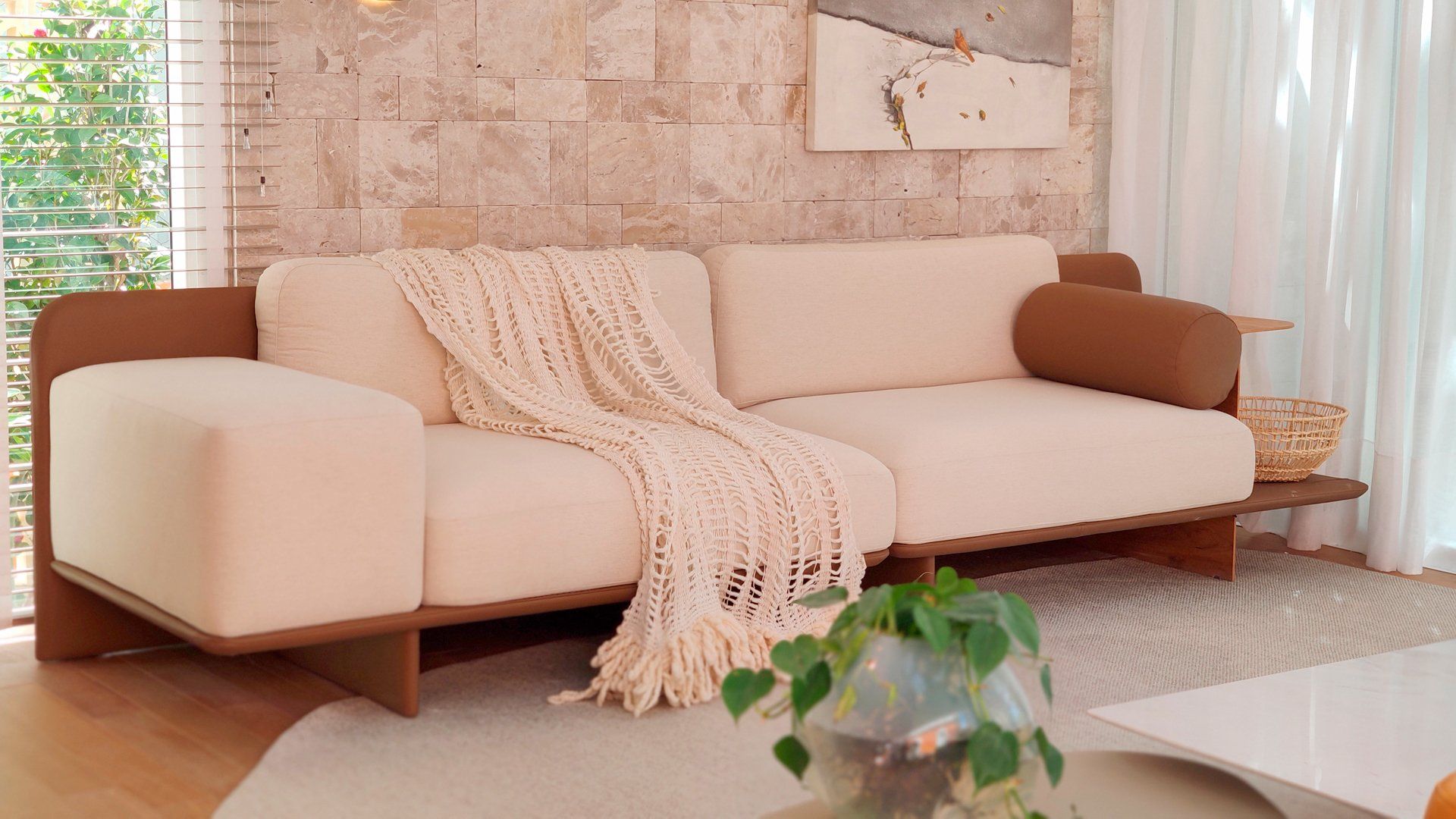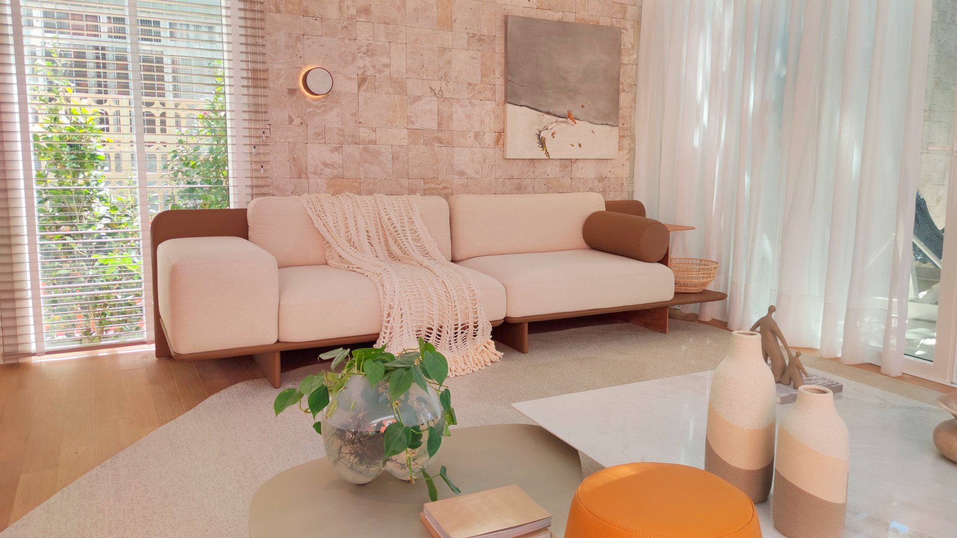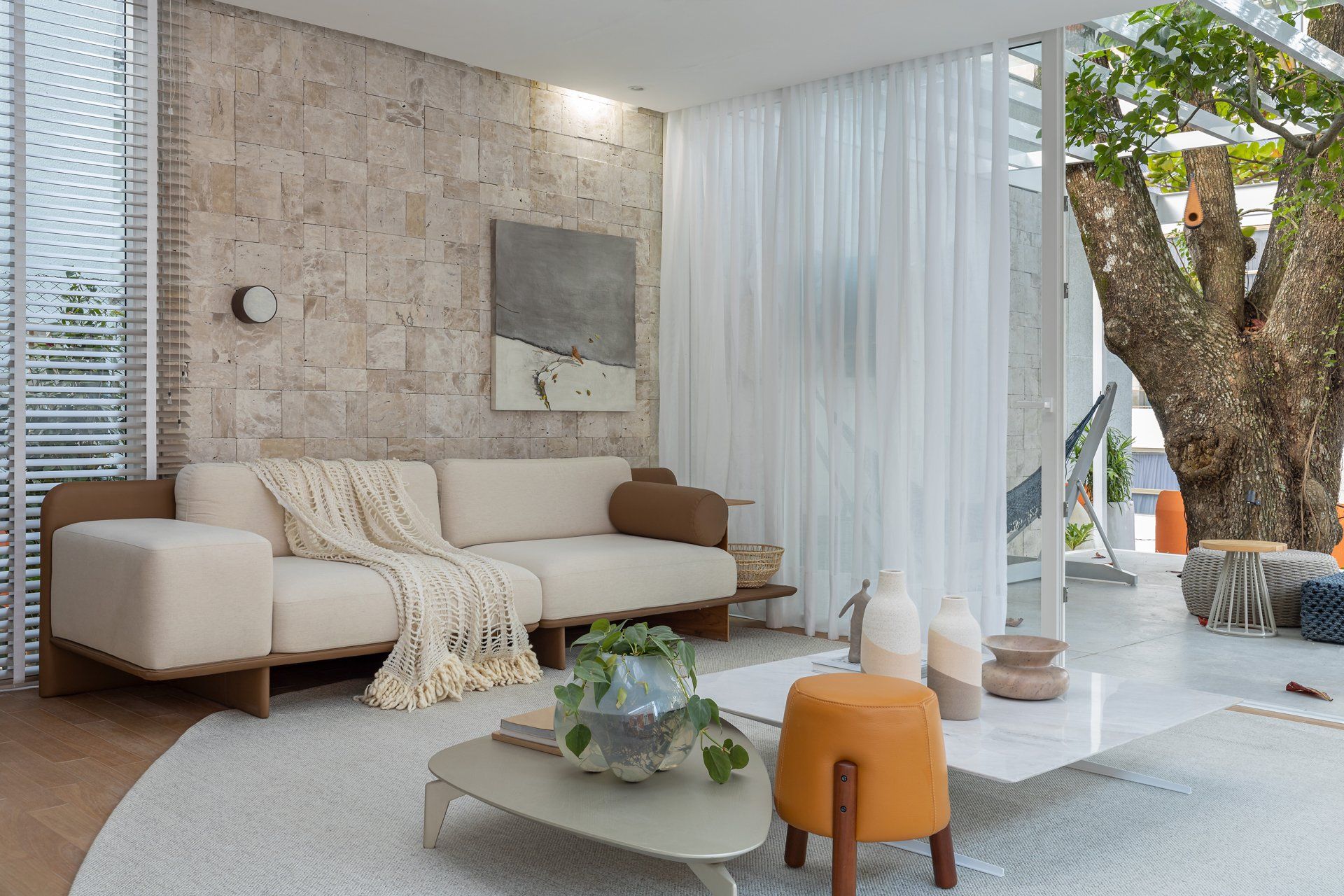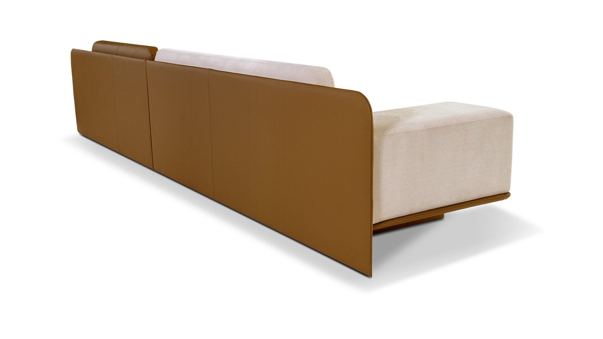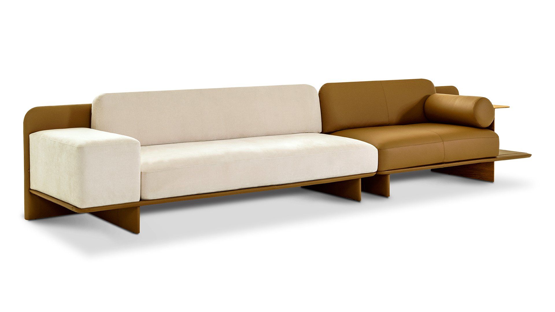 Com uma pegada anos 80, o sofá Lui traz um rigor na sua forma que é quebrado pela assimetria e pela variação dos braços, ora redondo, ora materializado em um generoso bloco retangular. A estrutura do sofá, toda revestida no próprio couro, já oferece o apoio necessário em uma das laterais, fazendo as vezes de mesa em chapa de aço dobrada e revestida com lâmina natural de madeira.