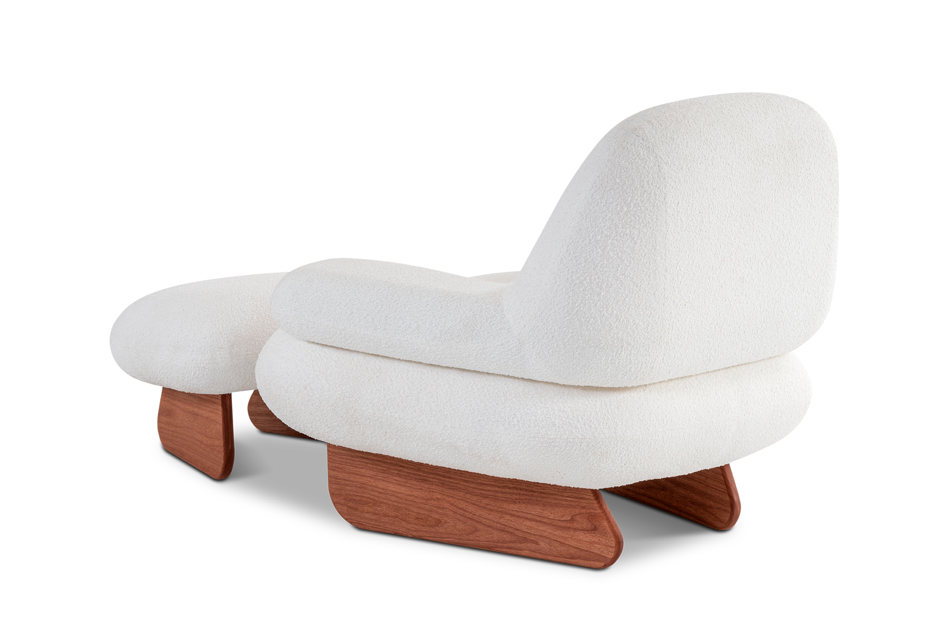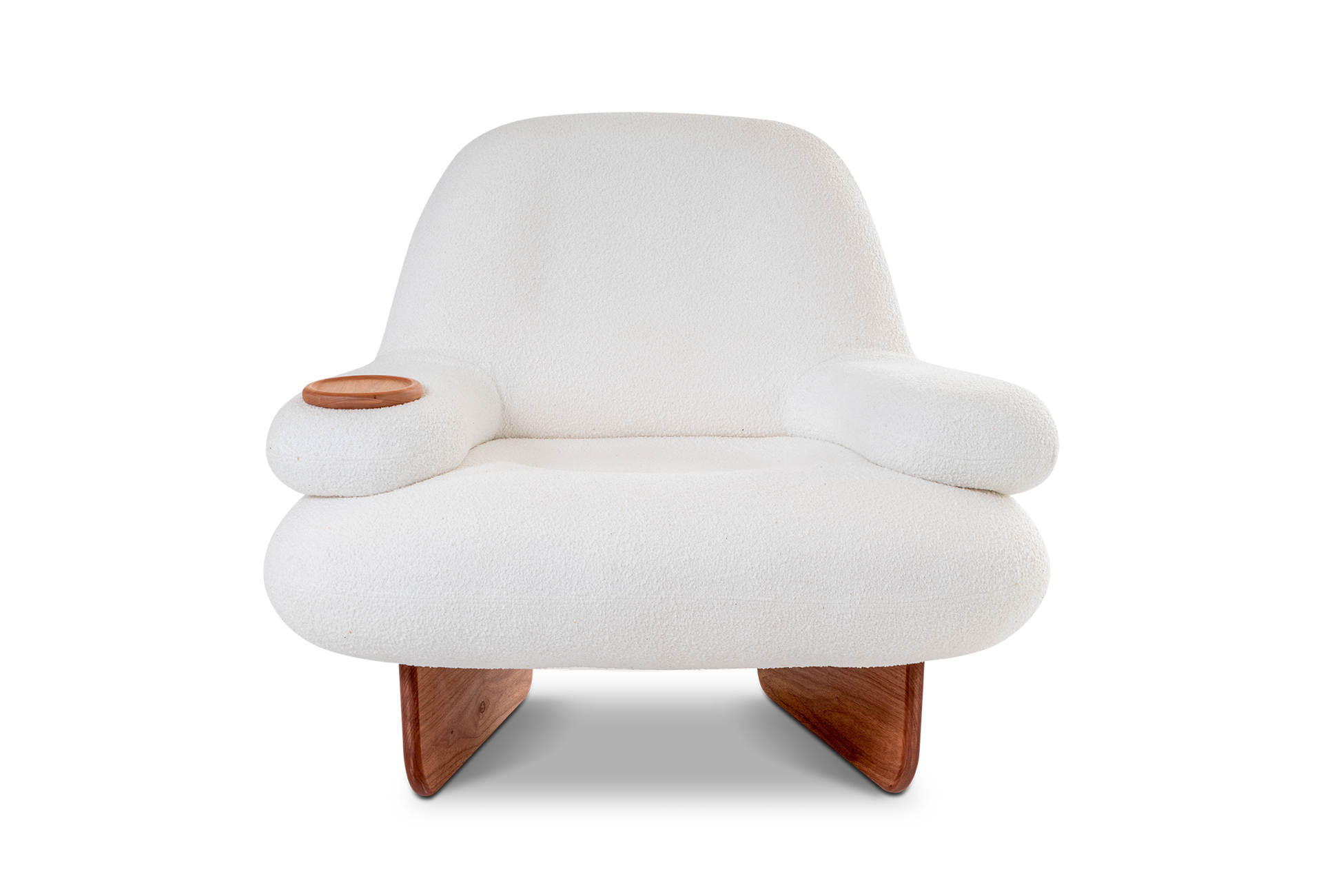 Refúgio, no sentido figurado, é um lugar de amparo, onde nos sentimos protegidos. A partir do substantivo masculino veio a inspiração para a criação dessa peça quase feminina, que combina robustez com um desenho de linhas suaves – como um colo aconchegante, pronto para receber. Sobre um dos braços, um elemento amadeirado faz as vezes de mesinha de apoio enquanto o puff complementa a composição, prolongando seu conforto.