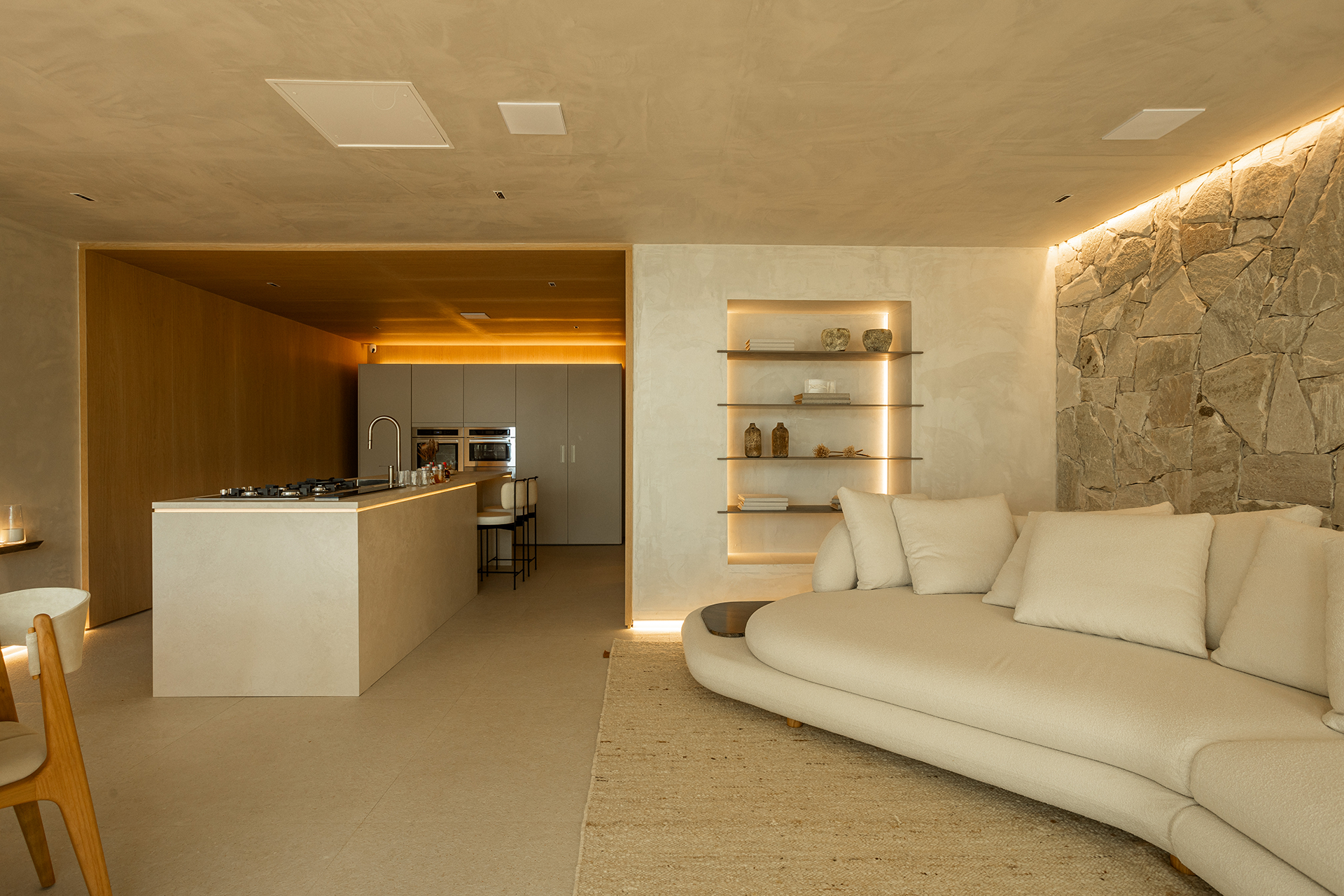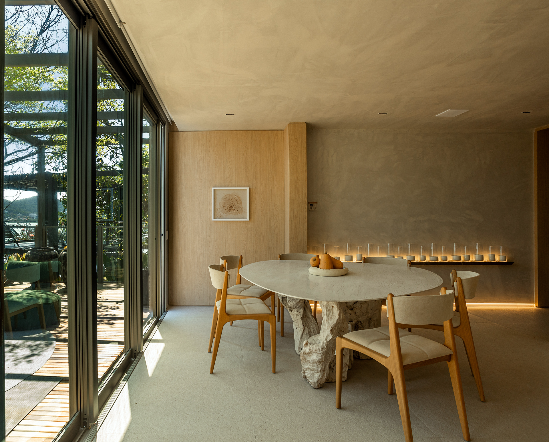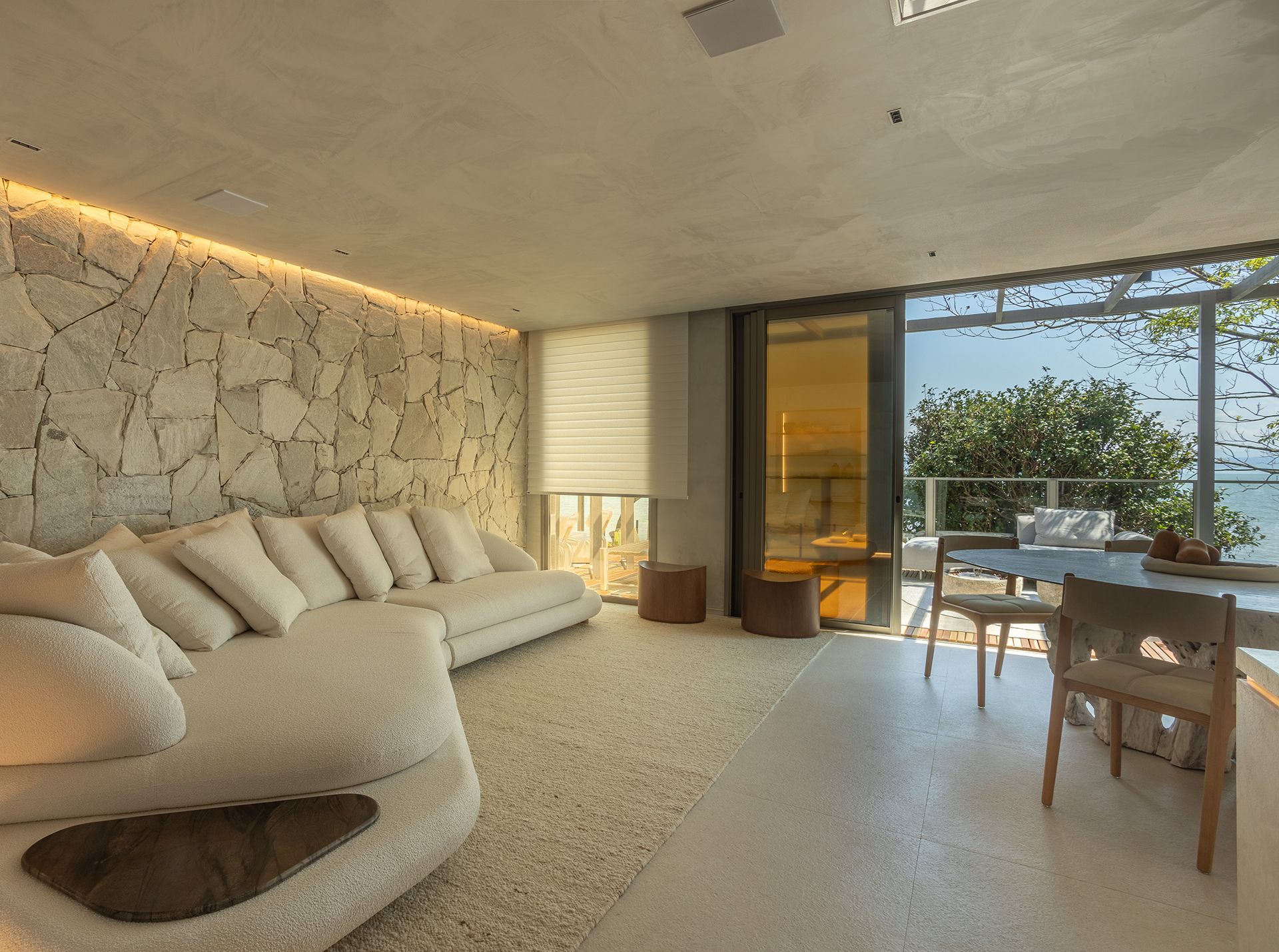 Concebido pela arquiteta Mariana Maisonnave, o espaço de 160m² é um hino à serenidade e ao acolhimento, com vistas panorâmicas para o mar e uma abundância de luz natural.