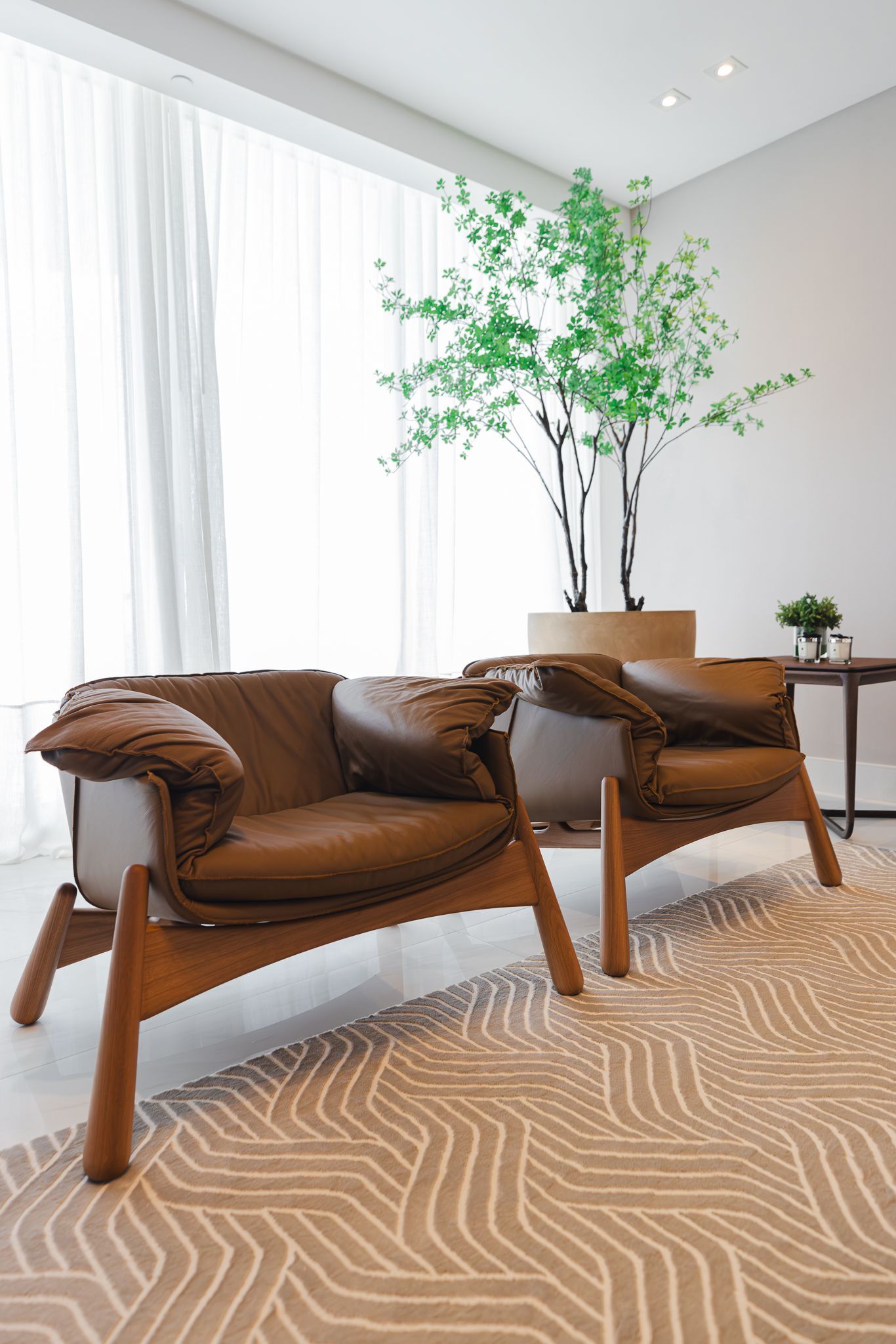 A Poltrona Charua é um dos grandes destaques do espaço. Seu design escultural valoriza os materiais nobres — como o couro natural e os pés em madeira de kitibá — resultando em uma peça que combina textura, elegância e autenticidade. Já o sofá Bob imprime leveza e aconchego, com proporções equilibradas e linhas suaves que traduzem a estética atemporal da Bell’Arte.