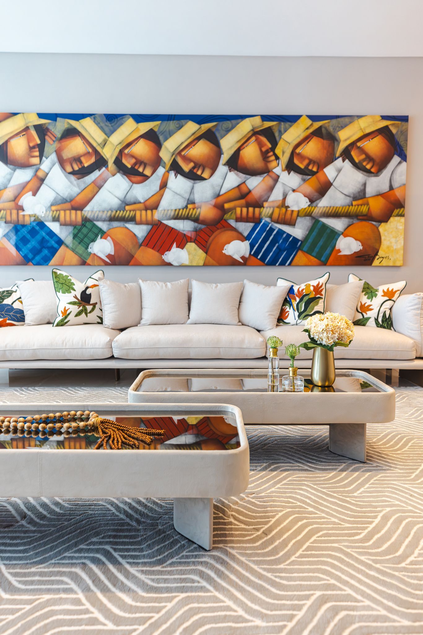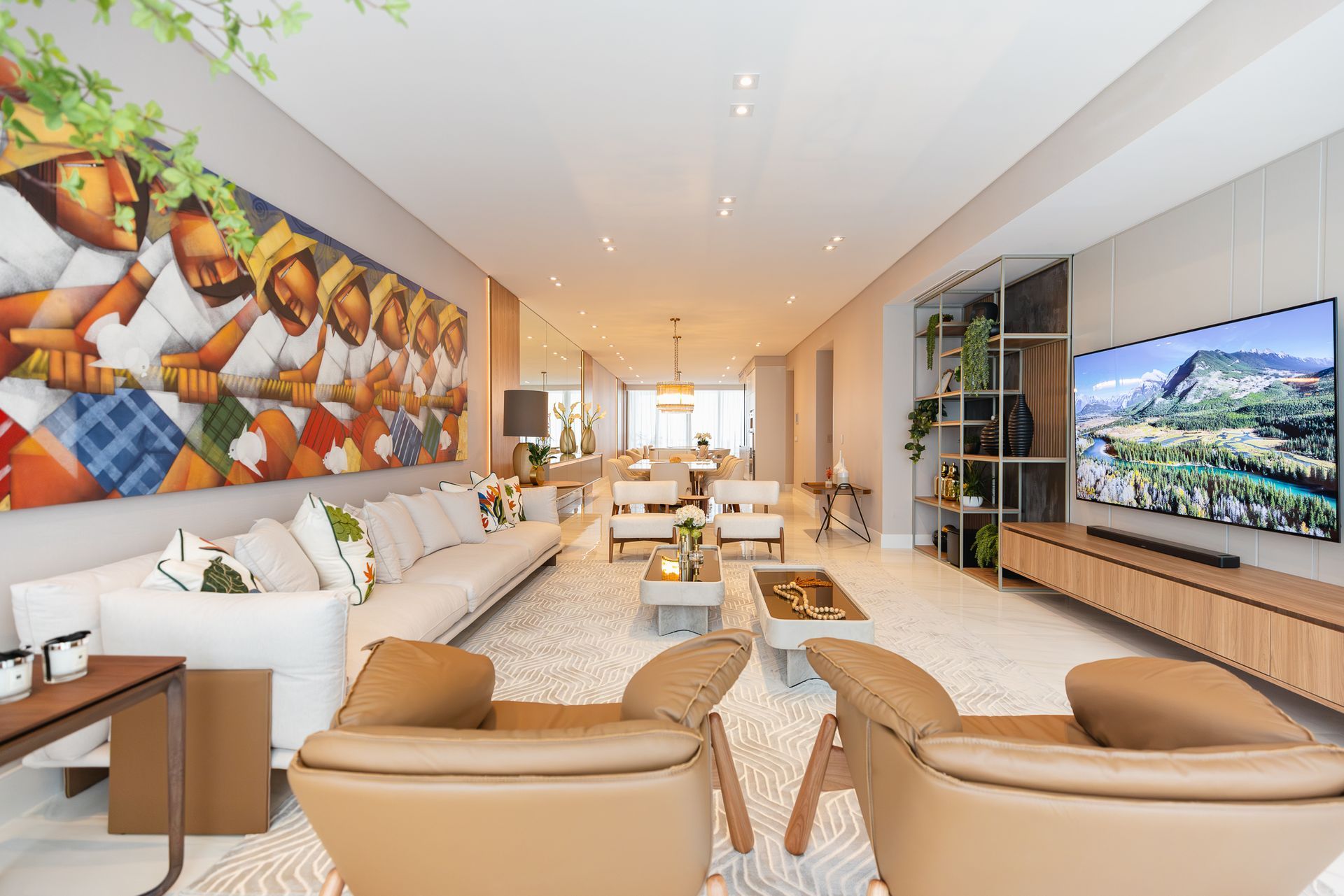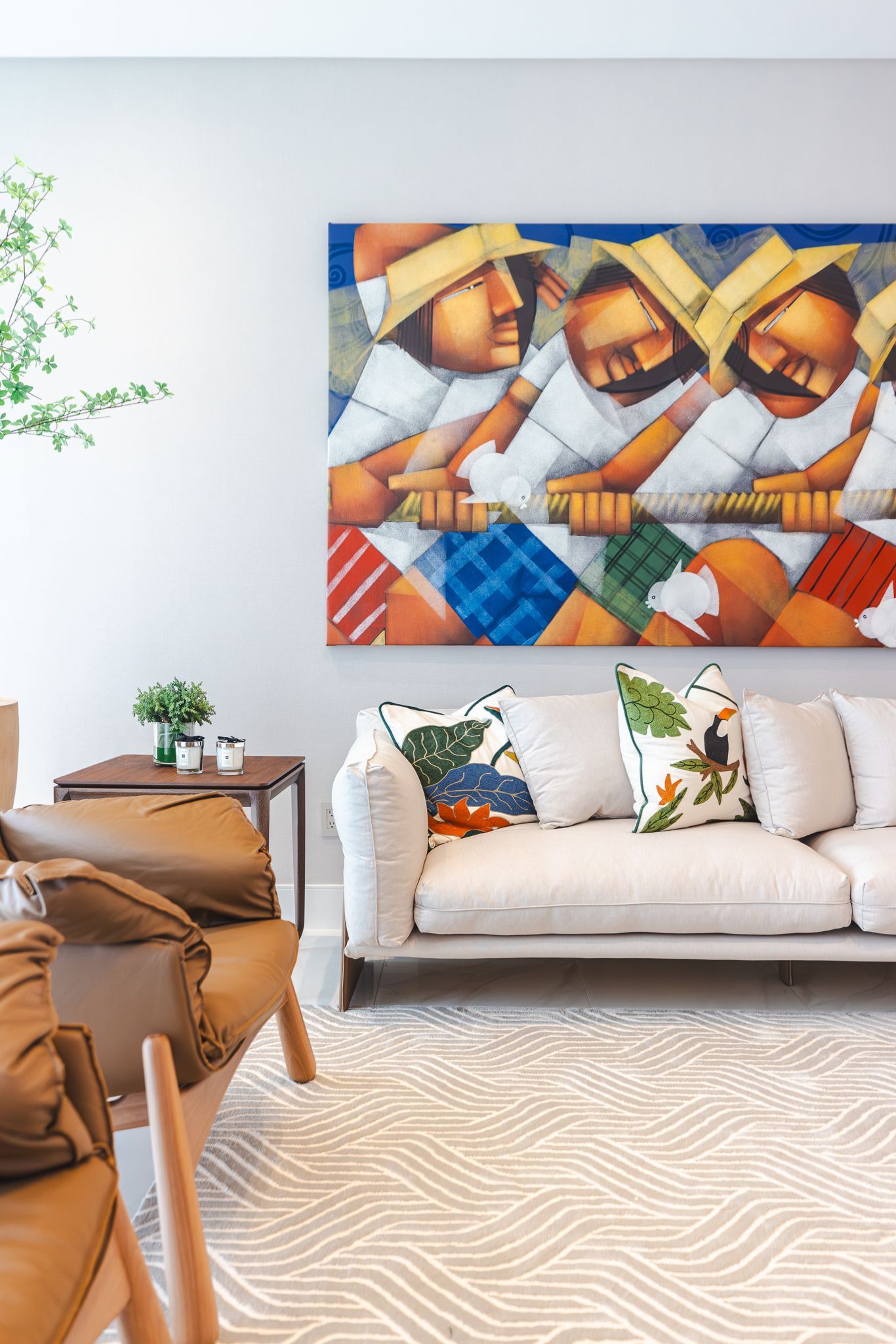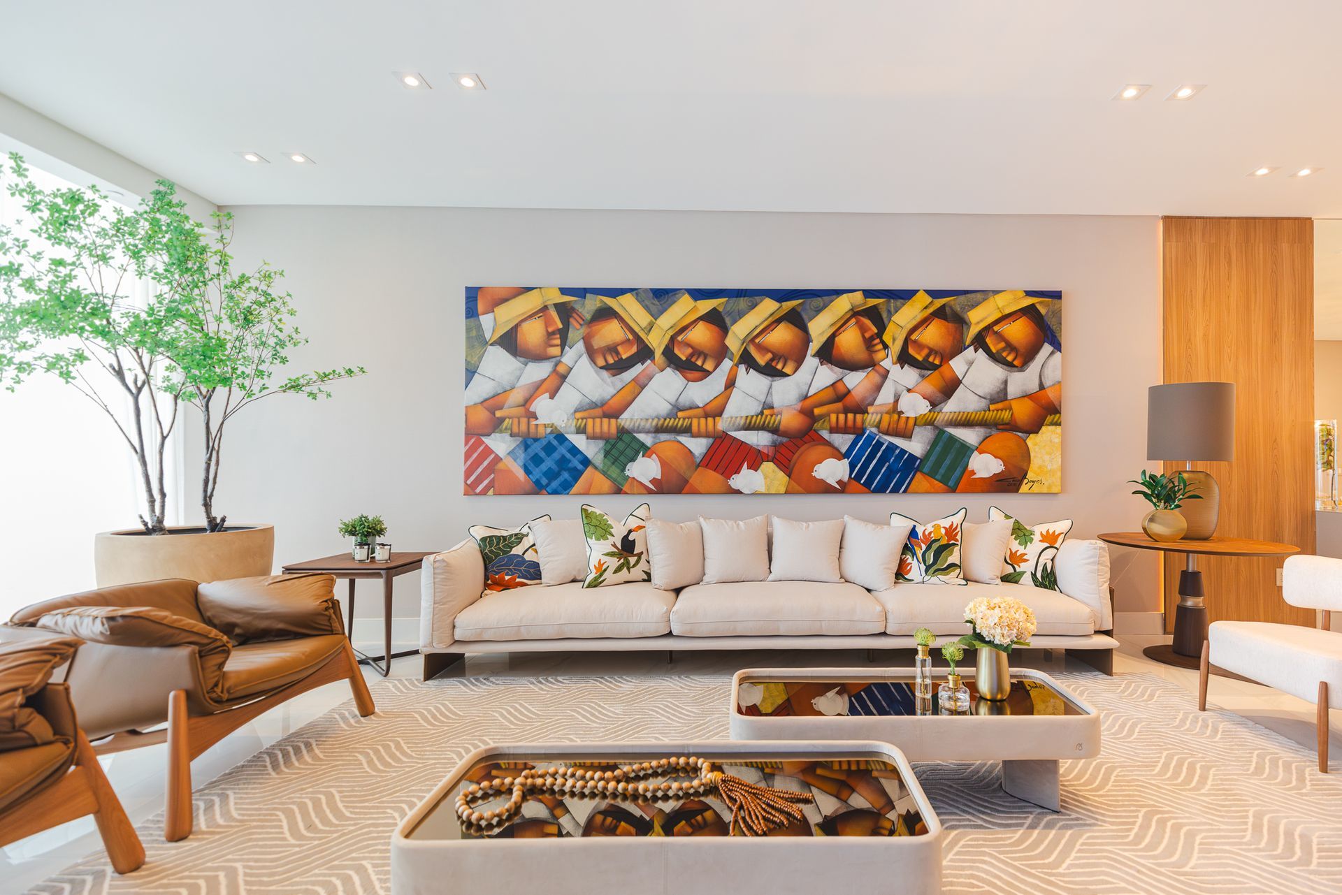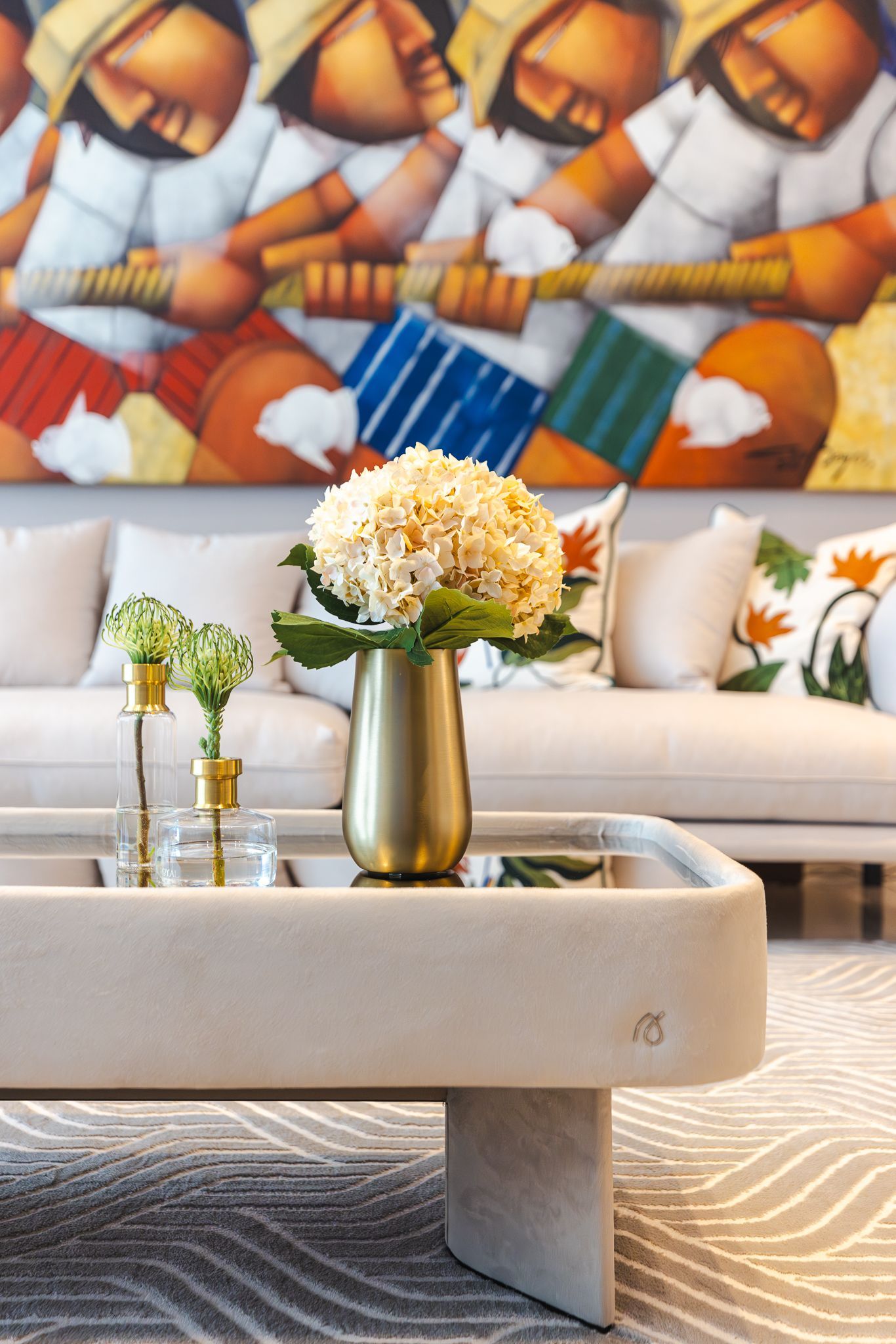 Completando a composição, a mesa Tangran, assinada por Arthur Casas, é o elemento central da sala. De formas orgânicas e materiais refinados, a peça une arte e funcionalidade, tornando-se a “cereja do bolo” deste ambiente sofisticado e convidativo.
